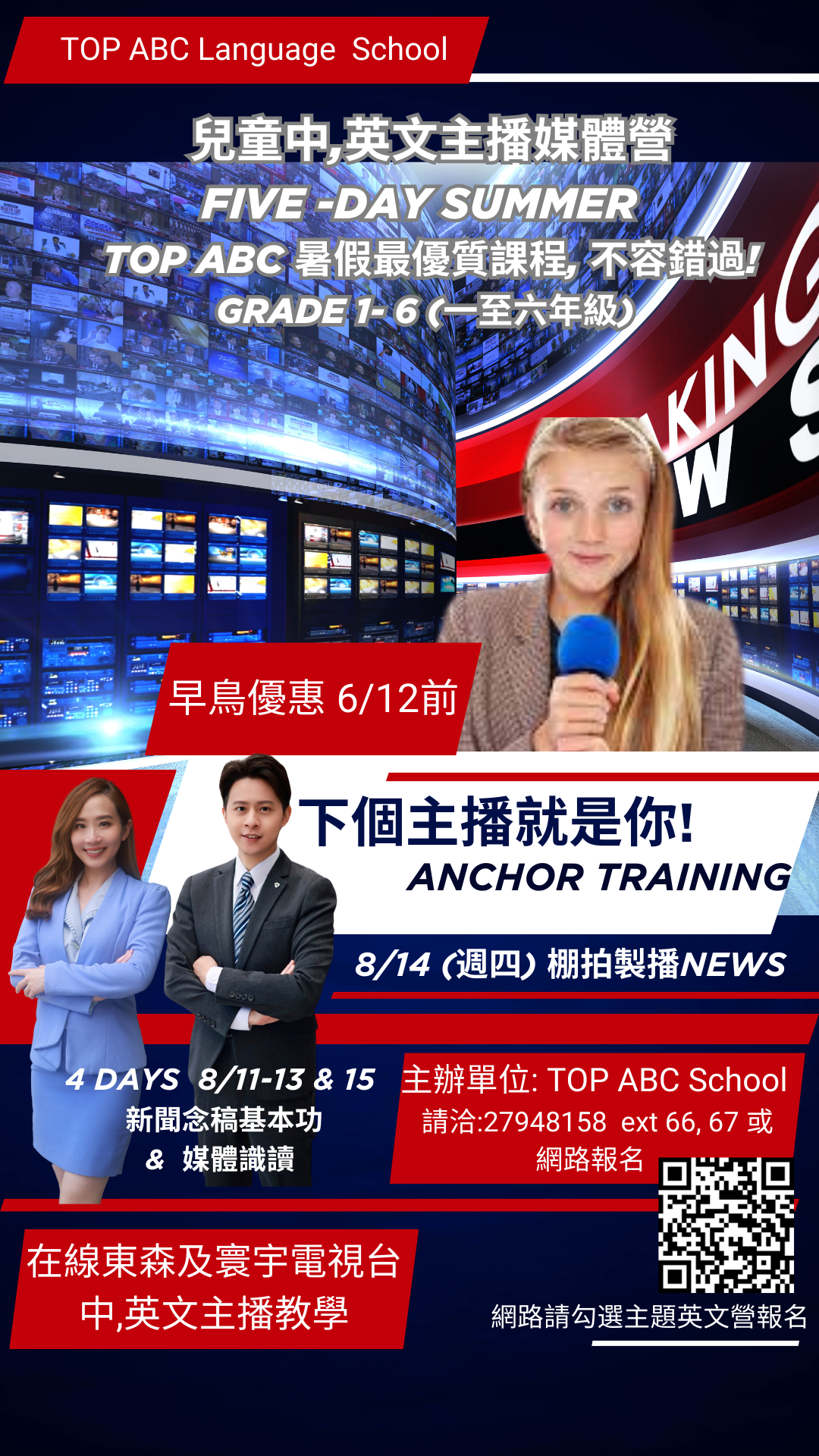 TOP ABC *東森幼幼中,英雙語主播媒體夏令營– 新聞報,抱,爆 (熱烈招生中!)